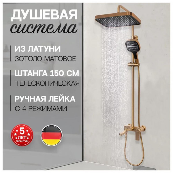 Смесители «Hansberge» производятся из санитарной латуни с высоким содержанием меди (70%), при обработке и покрытии смесителей используются самые передовые технологии, двойное никель-хром гальваническое покрытие, порошковая окраска в камере высокого давления. Перед упаковкой и отправкой продукции, сантехника «Hansberge» проходит контрольное тестирование на специальном оборудовании при наблюдении специалистов фабрики. Надёжный литой тяжёлый крепкий корпус выдерживает давление в 3 раза больше, чем давление в водопроводной системе и прослужит много лет без протечек. Рассчитан до 30 лет комфортной эксплуатации. Идеальные формы, эргономичный дизайн и плавный ход рычага добавляет наслаждения и удобство в использовании. Вес душевой системы без упаковки 4,8 кг В комплект входит всё необходимое: Смеситель 20х4 см Межосевое расстояние 15 см Длина (вынос) излива 18 см (поворотный) Ширина излива 4 см Ручная лейка (пластик): 13х13 см (4 режима) Верхний душ (пластик): 33х22 см (прямоугольник) Длина кронштейна 40 см Штанга телескопическая (регулируемая) 88-150 см Шланг: длина 1,5 м Прокладки Эксцентрики Отражатели 6 см Стильное и яркое дополнение вашему интерьеру. Немецкое качество. Прямая продажа от завода-производителя бренда Hansberge Все товары бренда «Hansberge» упакованы в крепкие коробки и проложены поролоном, это обеспечивает 100% гарантию того, что вы получите идеальный смеситель. Данный товар подойдет вам, если вы ищете смеситель для ванны и душа, душевой гарнитур, душевую систему, душевой комплект, душевую стойку, тропический душ со смесителем, душевую стойку со смесителем, стойку для душа, тропический душ комплект, комплект для душа, смеситель с лейкой и душем, душ со смесителем, душевой набор.