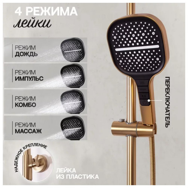 | Комплектация | верхний душ, душевая штанга с держателем лейки, ручной душ, смеситель, шланг, эксцентрики, декоратив |