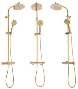 Душевая стойка PEA Bliss Gold Thermostat P8806 термостатическая - практичная и комфортная в использовании модель с термостатическим смесителем, ручным и тропическим душем, выполнена в роскошном золотом цвете. Смеситель с термостатом контролирует постоянную температуру воды, защищает от ее резких перепадов. Душевые системы PEA изготовлены из высококачественной латуни, долговечны и просты в уходе.