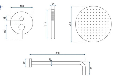 - диаметр тропического душа: 250 (золото) или 300 мм (черный, хром).