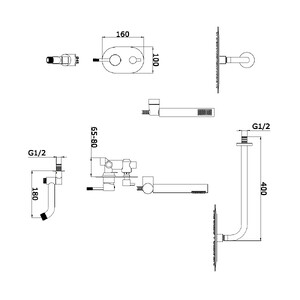 - Набор для скрытого монтажа в стену с тропическим душем, термостатический смеситель, поворотный излив.