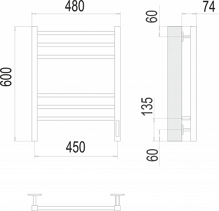 Внутри полотенцесушителя установлен сухой евротэн, который при включении питания быстро прогревает всю функциональную поверхность изделия. Прибор имеет универсальное (скрытое/ в розетку) подключение, диммер (регулятор температуры – 4 уровня), максимальная температура нагрева до 70° С.