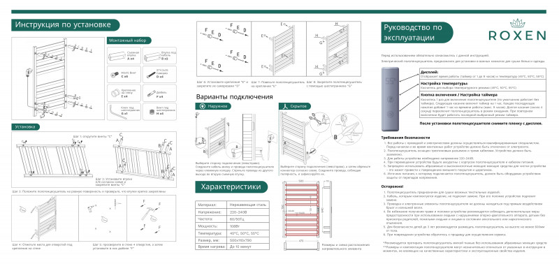 Полотенцесушитель Roxen Plaza 11040-5079C, хром, электрический, 50х79 - стильная модель с прямоугольными перекладинами. Полотенцесушитель имеет сенсорную панель управления, таймер отключения на 1-9 часов и регулировку температуры. Изготовлен из высококачественной нержавеющей стали толщиной 2 мм. Специальное покрытие надежно защищает изделие от воздействия влаги и механических повреждений. В качестве нагревательного элемента используется нагревательный кабель сухого типа, который при включении быстро и равномерно прогревает всю поверхность изделия и отлично держит температуру. Подключение при помощи кабель-вилки, либо возможен вариант скрытого электрического соединения. Каждый полотенцесушитель проходит лазерную обработку швов, что дает увеличенный гарантийный срок до 10 лет.