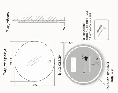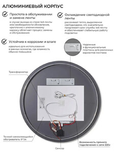 Сенсорное включение с плавным пуском срабатывает при легком касании. Функция антизапотевание (подогрев) включается вместе с подсветкой зеркала. Нагревательный элемент размещается на обратной стороне зеркала, который за пару минут делает поверхность изделия теплой. Благодаря этому зеркало не покрывается испариной во время водных процедур. Влагостойкое зеркальное полотно со шлифованной кромкой AGC-Premium не искажает и не затемняет отражение. Задний алюминиевый каркас для крепления светодиодной ленты является отличным способом отвода тепла, это спасает светодиоды от перегрева, а значит в разы продлевает срок их службы. Защита уровня IP44 от брызг и пыли позволяет безопасно устанавливать зеркало в помещениях с повышенной влажностью. Важным преимуществом зеркала является его низкое энергопотребление. Изделие укомплектовано прочными креплениями и готово к монтажу.