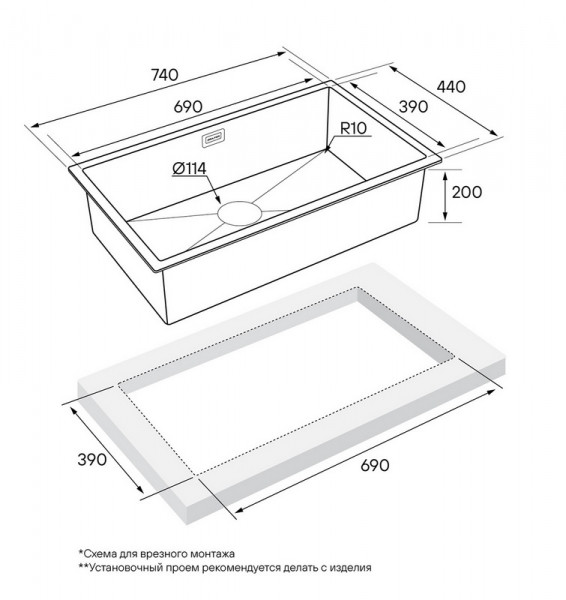 Размеры мойки 74х44х20см