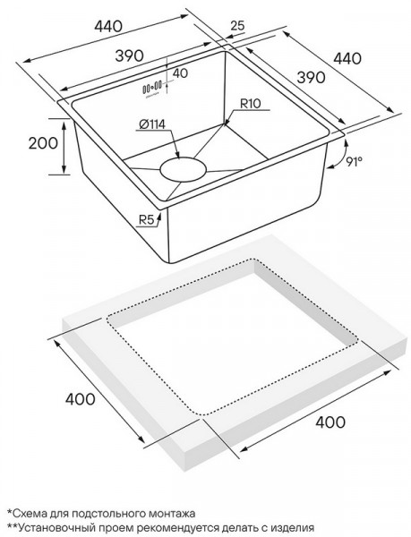 Способ установки: Врезная под столешницу / В один уровень со столешницей / Накладная на столешницу