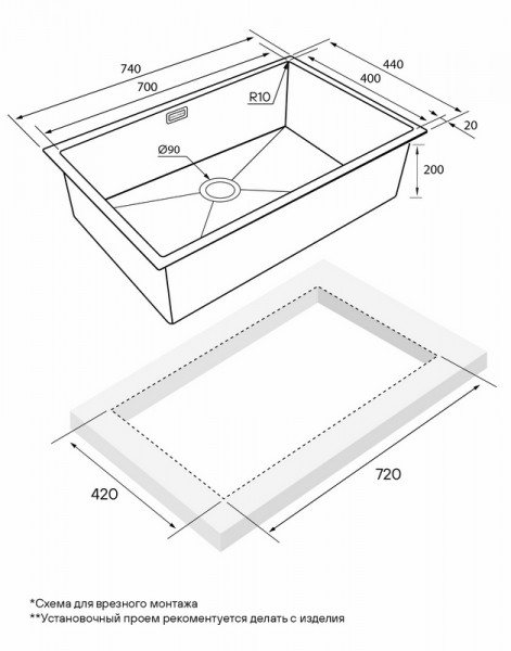 Способ установки: Врезная под столешницу / В один уровень со столешницей / Накладная на столешницу