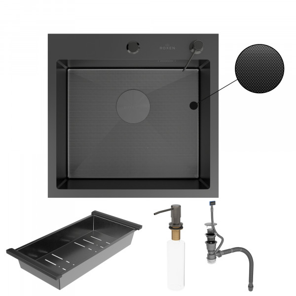 Кухонная мойка Roxen Simple 560220-50B-GR PVD (зернистая оружейная сталь) с коландером и дозатором в комплекте. Удобная модель в цвете оружейная сталь, сочетает в себе стильный современный дизайн и отличные эксплуатационные характеристики. Мойка изготовлена из аустенитной низкоуглеродистой стали марки AISI 304, которая обладает устойчивостью к коррозии, окислению и перепаду температур. Отличные шумопоглощающие характеристики мойки обеспечиваются шумоподавляющим составом Silent Protection и шумопоглощающими пластинами Soft Silence, которые располагаются по всей чаше мойки.
