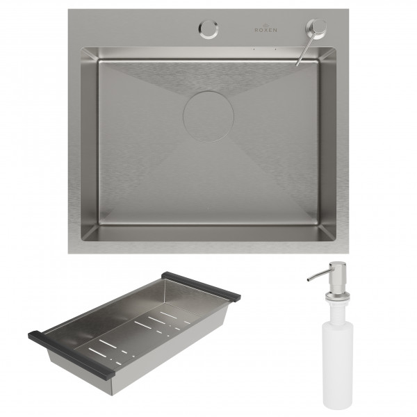 Кухонная мойка Roxen Simple 55х48 с коландером и дозатором в комплекте. Удобная прямоугольная модель с глубокой чашей, сочетает в себе стильный современный дизайн и отличные эксплуатационные характеристики. Мойка изготовлена из аустенитной низкоуглеродистой стали марки AISI 304, которая обладает устойчивостью к коррозии, окислению и перепаду температур. Уникальное покрытие Bruch Tech является защитным слоем, устойчивым к истиранию, появлению царапин и механических повреждений. Отличные шумопоглощающие характеристики мойки обеспечиваются шумоподавляющим составом Silent Protection и шумопоглощающими пластинами Soft Silence, которые располагаются по всей чаше мойки.