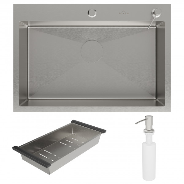 Кухонная мойка Roxen Simple 70х48 с коландером и дозатором в комплекте. Удобная прямоугольная модель, с глубокой просторной чашей, сочетает в себе стильный современный дизайн и отличные эксплуатационные характеристики. Мойка изготовлена из аустенитной низкоуглеродистой стали марки AISI 304, которая обладает устойчивостью к коррозии, окислению и перепаду температур. Уникальное покрытие Bruch Tech является защитным слоем, устойчивым к истиранию, появлению царапин и механических повреждений. Отличные шумопоглощающие характеристики мойки обеспечиваются шумоподавляющим составом Silent Protection и шумопоглощающими пластинами Soft Silence, которые располагаются по всей чаше мойки.