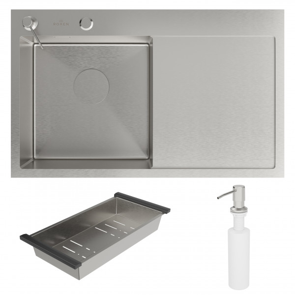 Кухонная мойка Roxen Vespa 78х48 левосторонняя с коландером и дозатором в комплекте. Удобная и практичная модель с большим крылом (с левой или правой стороны), с глубокой квадратной чашей, сочетает в себе стильный современный дизайн и отличные эксплуатационные характеристики. Мойка изготовлена из аустенитной низкоуглеродистой стали марки AISI 304, которая обладает устойчивостью к коррозии, окислению и перепаду температур. Уникальное покрытие Bruch Tech является защитным слоем, устойчивым к истиранию, появлению царапин и механических повреждений. Отличные шумопоглощающие характеристики мойки обеспечиваются шумоподавляющим составом Silent Protection и шумопоглощающими пластинами Soft Silence, которые располагаются по всей чаше мойки.