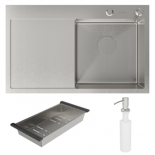Кухонная мойка Roxen Vespa 78х48 правосторонняя с коландером и дозатором в комплекте. Удобная и практичная модель с большим крылом (с левой или правой стороны), с глубокой квадратной чашей, сочетает в себе стильный современный дизайн и отличные эксплуатационные характеристики. Мойка изготовлена из аустенитной низкоуглеродистой стали марки AISI 304, которая обладает устойчивостью к коррозии, окислению и перепаду температур. Уникальное покрытие Bruch Tech является защитным слоем, устойчивым к истиранию, появлению царапин и механических повреждений. Отличные шумопоглощающие характеристики мойки обеспечиваются шумоподавляющим составом Silent Protection и шумопоглощающими пластинами Soft Silence, которые располагаются по всей чаше мойки.