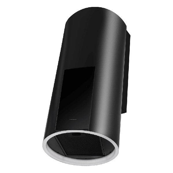 Корпус цилиндрической формы, выполненный из нержавеющей стали с термостойким покрытием, устанавливается на стену над поверхностью плиты. Алюминиевый многослойный жироулавливающий фильтр находится в нижнем торце вытяжки.