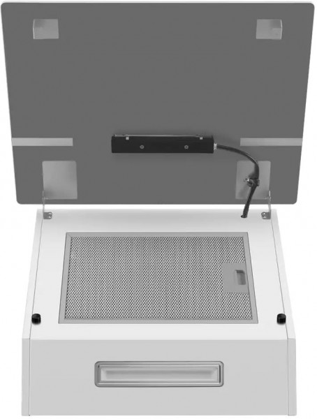 Корпус сделан из эмалированной стали. Фасад выполнен полностью из закаленного стекла . За ней скрыт алюминиевый жироулавливающий фильтр, который легко снимается и полностью разбирается для чистки. Загрязненный воздух втягивается по периметру откидной панели.