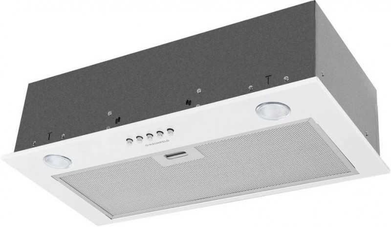 Корпус выполнен из нержавеющей стали. На фронтальной панели вытяжки белого цвета установлен многослойный жироулавливающий алюминиевый фильтр. Он легко вынимается из вытяжки и полностью разбирается, что значительно упрощает его очистку.