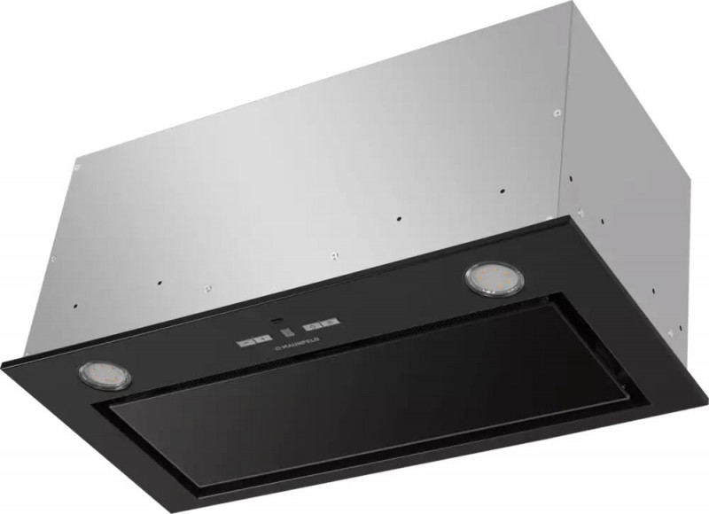 Корпус сделан из нержавеющей стали. Матовый фасад прекрасно сочетается с откидной панелью из закаленного глянцевого стекла черного цвета. За ней располагается металлический жироулавливающий фильтр, который легко снимается и полностью разбирается для чистки. Загрязненный воздух втягивается по всему периметру панели.