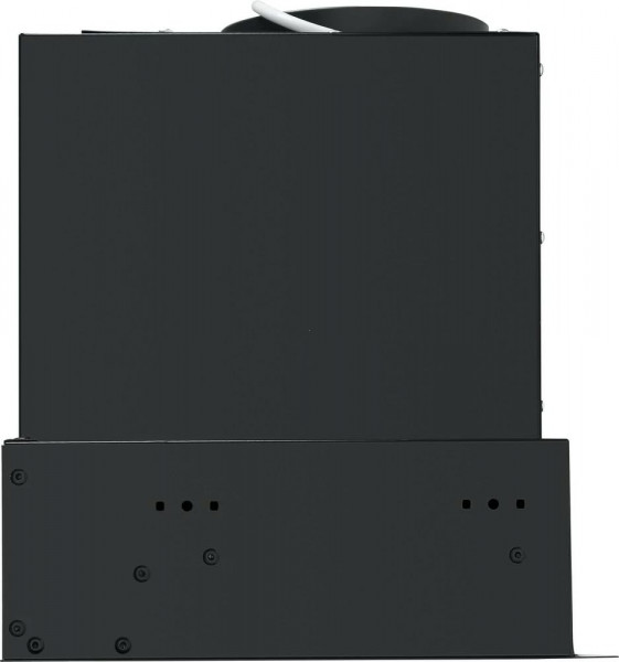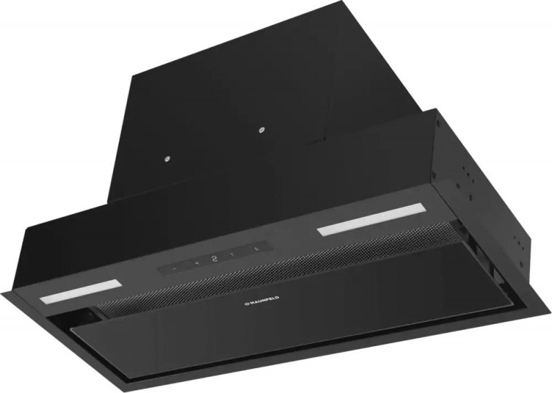 Корпус сделан из нержавеющей стали. На фасаде вытяжки черного цвета находится откидная панель, выполненная из закаленного стекла. За ней располагается легко снимающийся жироулавливающий алюминиевый фильтр. Загрязненный воздух втягивается по всему периметру панели.