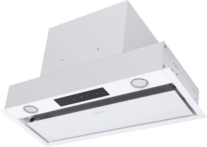 Корпус сделан из нержавеющей стали. На фасаде вытяжки белого цвета находится откидная панель, выполненная из закаленного белого стекла. За ней располагается легко снимающийся жироулавливающий алюминиевый фильтр. Загрязненный воздух втягивается по периметру откидной панели.