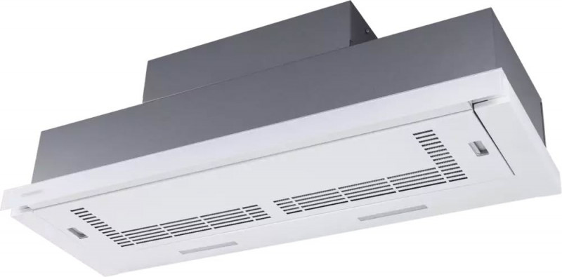 - Фасад выдвижной панели выполнен из закаленного глянцевого стекла белого цвета. Основная рабочая и выдвижная панель изготовлены из нержавеющей стали с эмалированным белым покрытием. Откидные панели на них, также белого цвета, сделаны с вентиляционными прорезями и скрывают за собой 2 легко вынимаемых многослойных алюминиевых жироулавливающих фильтра. Корпус сделан из нержавеющей стали.