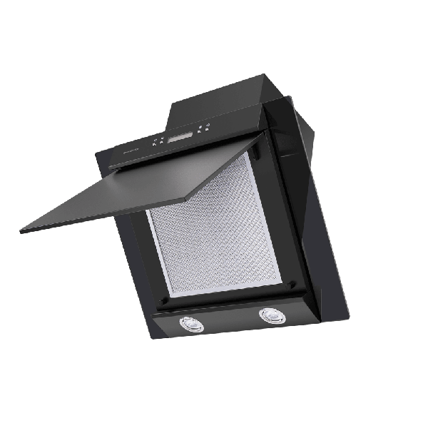 Корпус и фронтальная часть сделаны из матированной нержавеющей стали черного цвета. Многослойный жироулавливающий алюминиевый фильтр, скрытый за откидной панелью, легко вынимается и полностью разбирается, что сильно упрощает его чистку. Рабочая зона увеличена за счет боковых панелей из закаленного стекла.