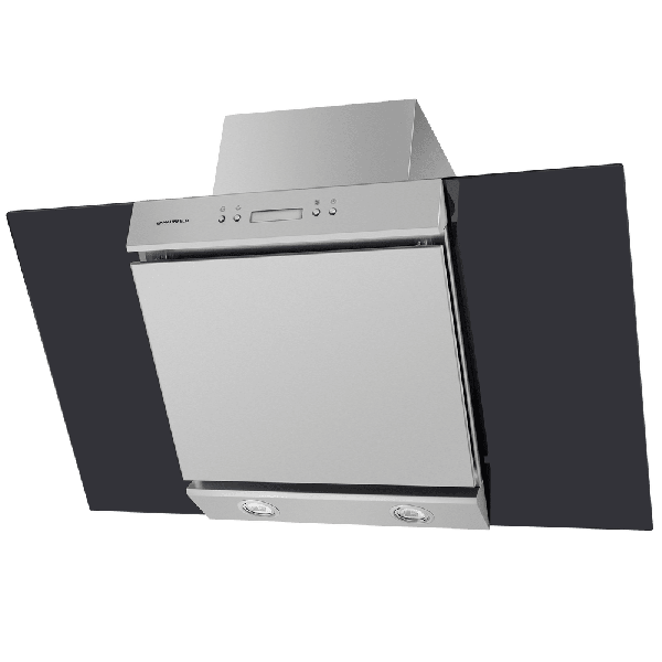 Корпус и откидная панель сделаны из нержавеющей стали с эмалированным покрытием черного цвета. Многослойный жироулавливающий алюминиевый фильтр, скрытый за откидной панелью, легко снимается и полностью разбирается, что сильно упрощает его чистку. Рабочая зона увеличена за счет боковых панелей из закаленного глянцевого стекла черного цвета.