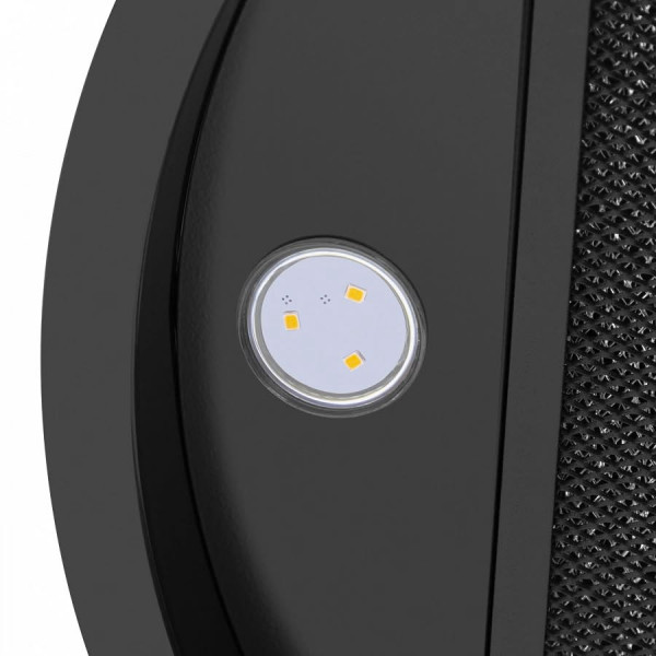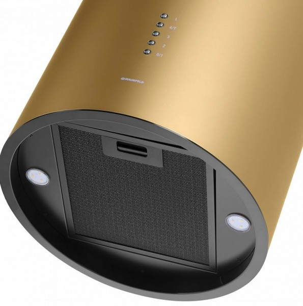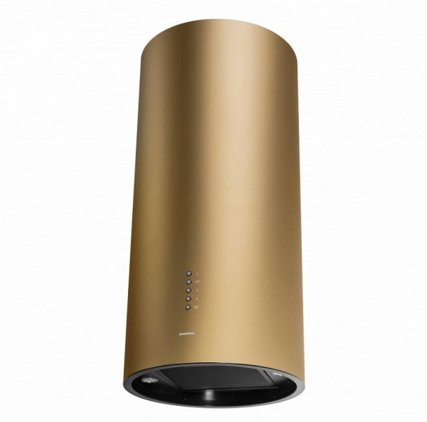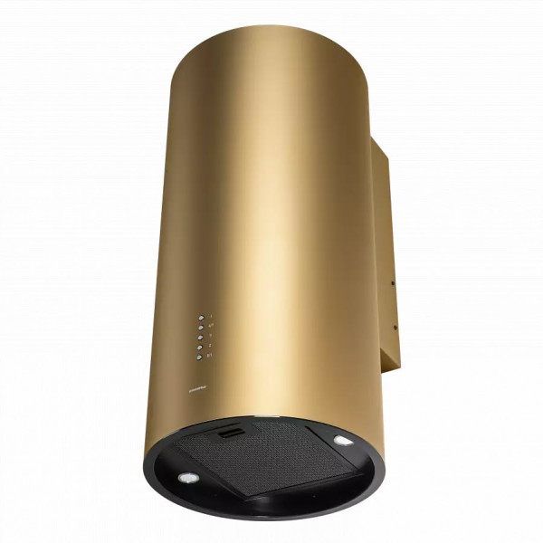 Корпус цилиндрической формы, сделанный из нержавеющей стали с термостойким покрытием, монтируется на стену над варочной поверхностью. Нижний торец вытяжки выполнен в черном акцентном цвете. Специальный многослойный жироулавливающий фильтр легко снимается и полностью разбирается, что сильно упрощает его чистку.