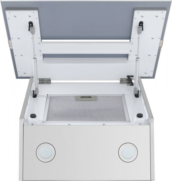 Корпус выполнен из матированной нержавеющей стали. Откидной фасад из закаленного глянцевого стекла черного цвета украшен стальными вставками. Загрязненный воздух втягивается по всему периметру панели через алюминиевый жироулавливающий фильтр, который легко снимается и полностью разбирается, что сильно упрощает его чистку. Особое внимание заслуживает система фиксации откидной панели - это газ-лифты и магнитные защелки.