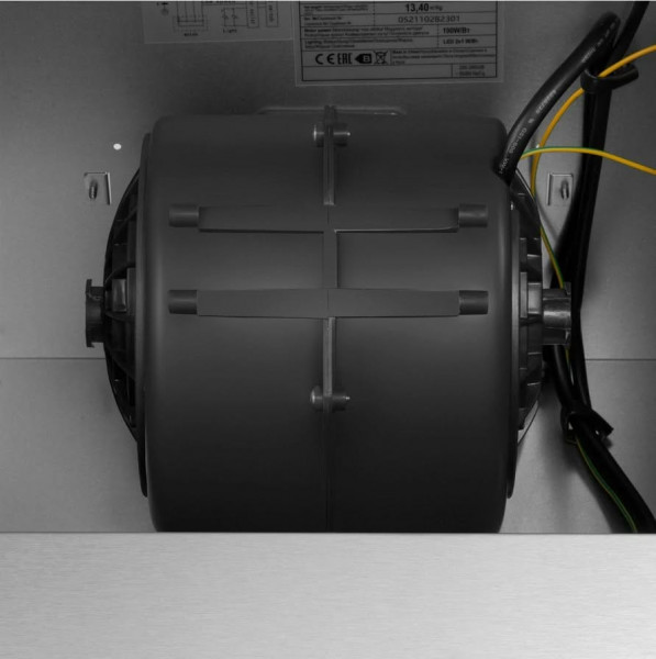 Мощность мотора 222 Вт позволяет достигнуть производительности в 1050 м3/ч, При работе вытяжки на самой высокой скорости уровень шума не выше 54 дБ.