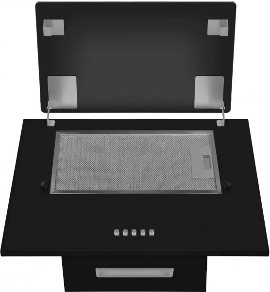 Фасад выполнен эмалированной стали закаленного стекла. Откидная панель надежно фиксируется магнитными упорами. За ней скрывается алюминиевый жироулавливающий фильтр, который легко снимается и полностью разбирается, что сильно упрощает чистку. Загрязненный воздух втягивается по всему периметру откидной панели.