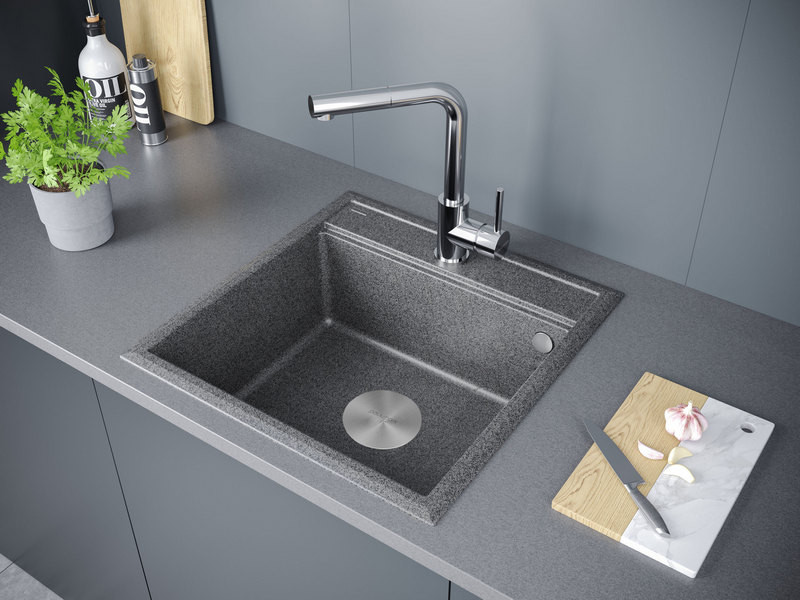 Стильная и прочная мойка из композитного материала на основе гранита для создания комфортной рабочей зоны на вашей кухне. Для создания привлекательного визуального образа мойка укомплектована декоративной накладкой, которая плотно фиксируется в горловине мойки и закрывает отверстие выпуска, не препятствуя при этом сходу воды.