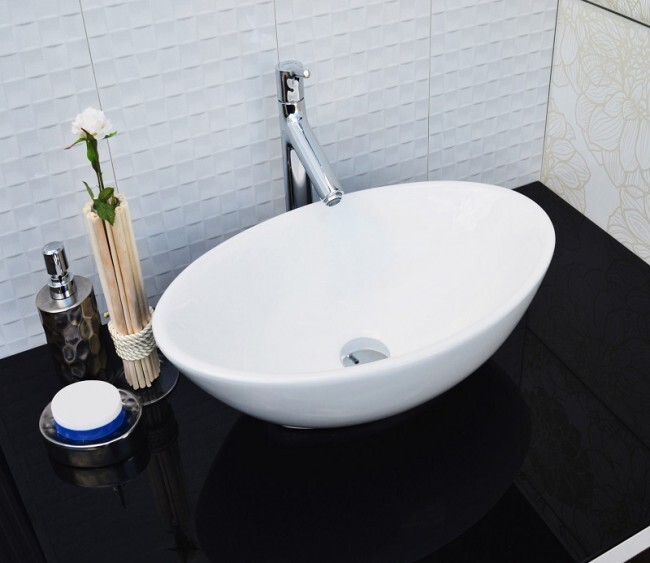 Овальная накладная модель для монтажа на столешницу. Отверстие для смесителя и отверстие для перелива отсутствуют.
