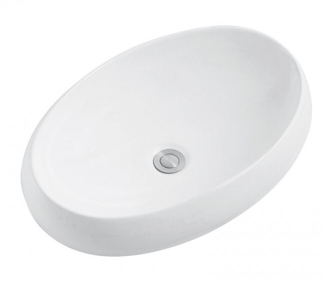 Овальная накладная модель для монтажа на столешницу. Отверстие для смесителя и отверстие для перелива отсутствуют.