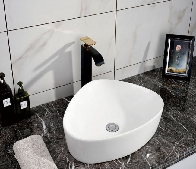 Накладная модель нестандартной формы для монтажа на столешницу. Отверстие для смесителя и отверстие для перелива не предусмотрено.