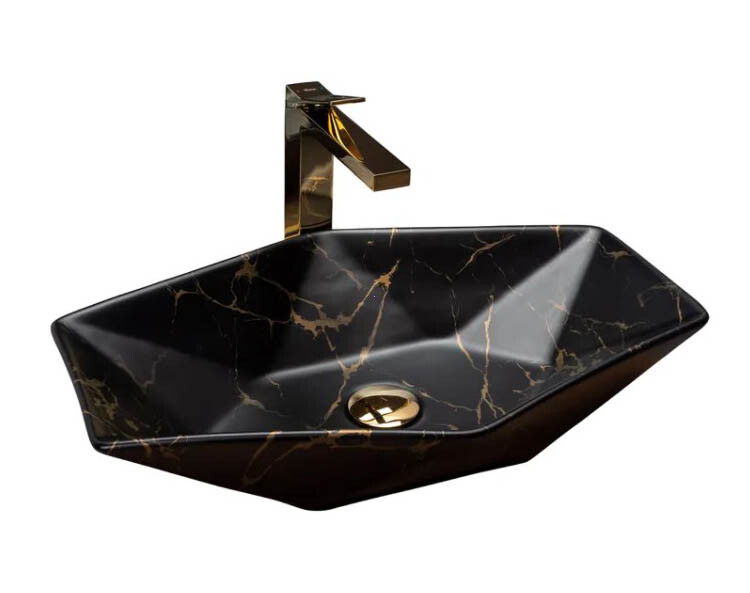 Умывальник Rea Vegas Black Marble U0994 56,5х36,5 - модель, выполненная в черном цвете с необычным дизайном и многоугольной формой чаши, которая станет изящным акцентом в ванной комнате. Раковина изготовлена из высококачественной санитарной керамики, которая не требует сложного ухода. Оптимальная глубина умывальника предотвращает попадание брызг на столешницу. Монтаж осуществляется на столешницу.