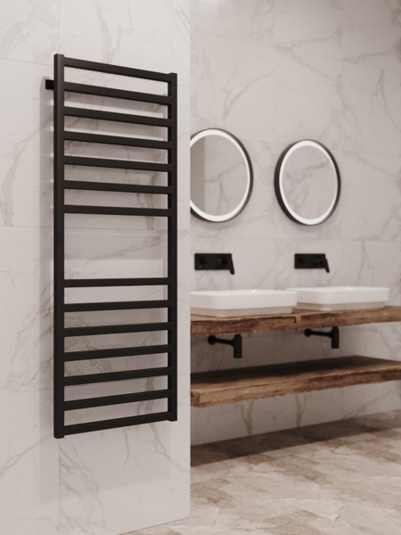 Черный электрический полотенцесушитель Stinox комплектуется черным ТЭНом скрытого монтажа. В комплект поставки теплоноситель не входит.