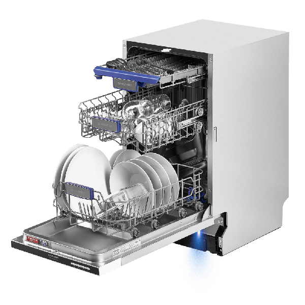 Электронное управление с дисплеем расположено в торце загрузочной дверцы. Функционал данной модели позволяет вам выбрать программу мойки, включить половинную загрузку, выставить время отсрочки старта (1-24 часов).
