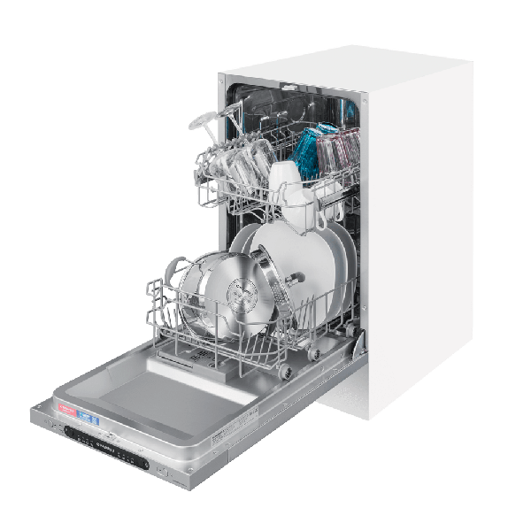 В посудомоечную машину помещается много посуды. Можно накопить её в течение дня или помыть сразу всё после семейного торжества или вечеринки с друзьями. Вместимость — до 9 комплектов посуды.