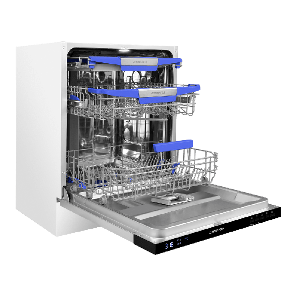 В машине максимально эффективно организовано внутреннее пространство. Есть удобная корзина для столовых приборов и мелкой утвари. Верхняя корзина — с изменяемой высотой установки, чтобы можно было мыть посуду разного размера и объёмов.