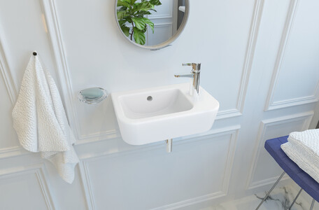 Конструкция чаши умывальника и расположение смесителя позволяют максимально избежать брызг воды при использовании изделия. Сливное отверстие раковины и точно выверенный угол уклона обеспечивают слив до 30 литров воды в минуту, что позволяет использовать умывальник без ограничений мощности потока и опасения перелива воды.