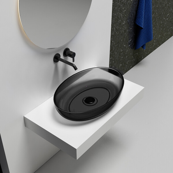 Накладная модель из полиэфирной смолы для монтажа на столешницу или на тумбу. Без перелива и без отверстия под смеситель.