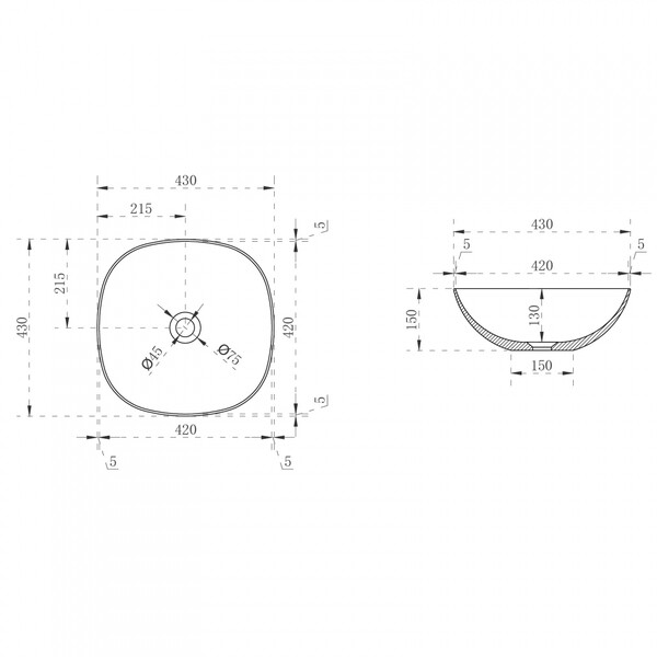 Накладная модель из полиэфирной смолы для монтажа на столешницу или на тумбу. Без перелива и без отверстия под смеситель.