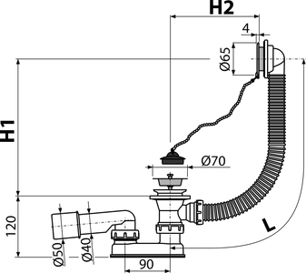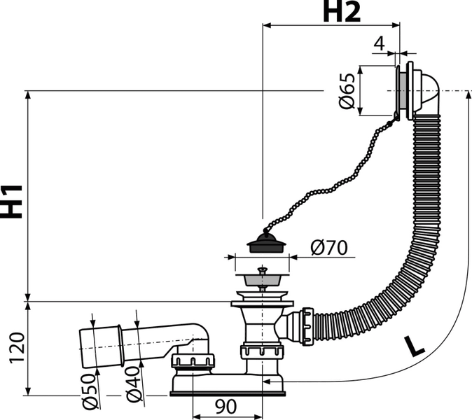 Сифон для ванны AlcaPlast A501 с пробкой из ПВХ на цепочке. Подходит для всех типов ванн. Длина шланга системы перелива - 570 мм. Выпускное отверстие - Ø52 мм.