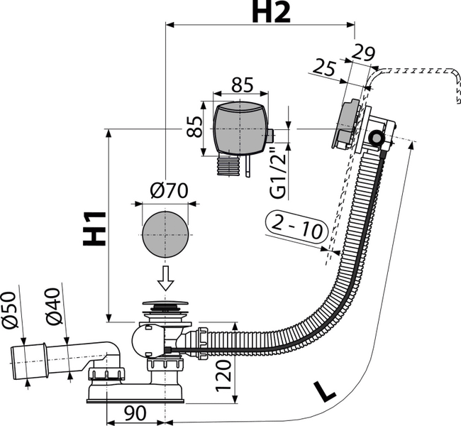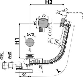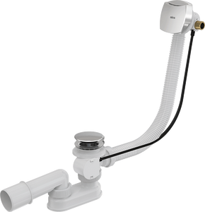 Сифон для ванны AlcaPlast A564CRM1 80 с функцией напуска воды, для ванн со стоковым отверстием 52 мм, с полуавтоматическим управлением. Сливная решетка изготовлена из латуни, поворотная накладка и пробка слива - из хромированного пластика. Слив-перелив с функцией наполнения ванны оснащен аэратором Neoperl и соединен с мокрым затвором гибким шлангом длиной 800 мм. Конструкцией предусмотрено минимальное расстояние от стенки ванны, так, что вода не течет по стенке и, в то же время, видимой остается лишь поворотная накладка. Диаметр боковой подводки для подготовленной воды 1/2”.