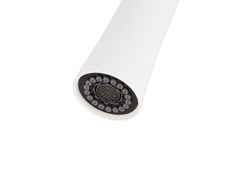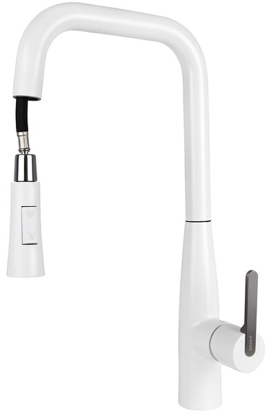 Однорычажный смеситель для кухни с поворотным изливом и вытяжным душем украсит современный интерьер. Благодаря фирменному картриджу управление напором и температурой воды легкое и плавное. Корпус крана выполнен из высококачественной латуни, не подверженной коррозии от длительного контакта с водой. Матовое покрытие и белый цвет крана исключает наличие брызг и пятен, что значительно упращает уход за смесителем. Особенностью данной модели является наличие вытяжной лейки, что впоследствии облегчит мытье посуды и гигиеническую уборку мойки.