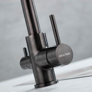 Смеситель для кухни Paulmark ESSEN в исполнении «вороненая сталь» (модель ES213011-GM) — это гармоничное сочетание передовых технологий, надёжности и лаконичного дизайна. Корпус смесителя изготовлен из высококачественной бессвинцовой латуни, соответствующей строгим европейским гигиеническим стандартам, что гарантирует безопасность и долговечность использования.