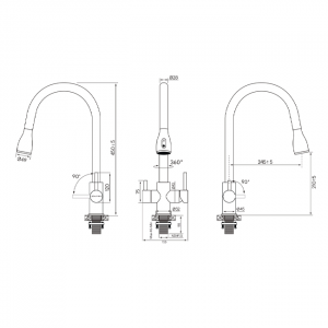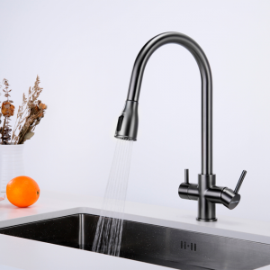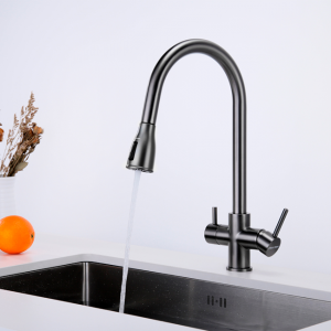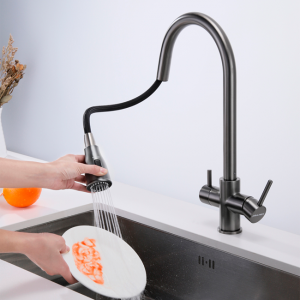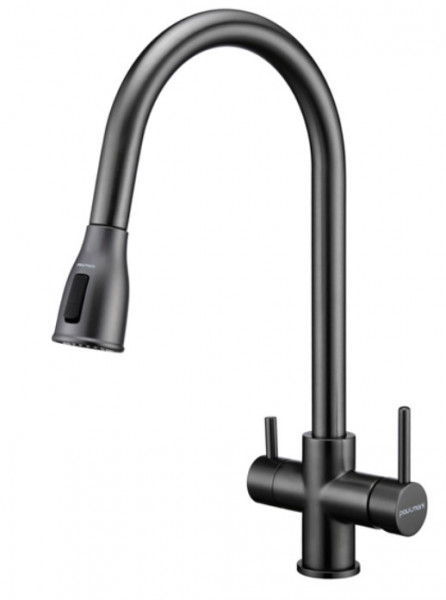 Модель оснащена выдвижным изливом с плавным ходом, поворотным корпусом для удобства при мытье посуды и овощей, а также функцией подключения системы фильтрации питьевой воды — сочетание практичности и эстетики для современной кухни.