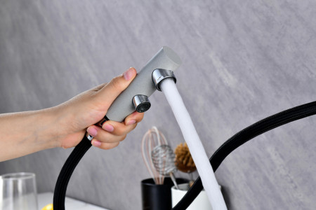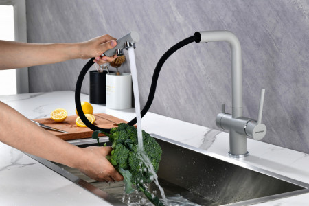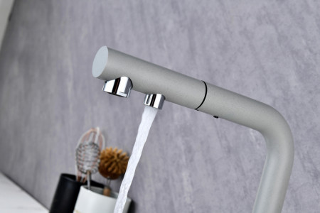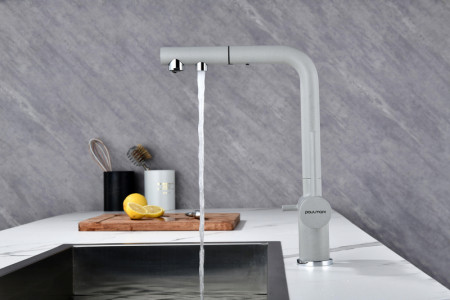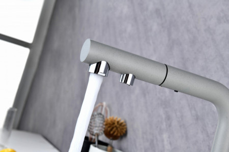 Смеситель для кухни Paulmark Serpentine SE213222-GRS в стильном исполнении «серый дым» идеально впишется в современный интерьер и обеспечит высокий уровень комфорта. Модель оснащена выдвижным поворотным изливом, что значительно расширяет зону доступа воды и упрощает уход за раковиной и посудой. Дополнительно предусмотрена возможность подключения системы фильтрации питьевой воды — практичное решение для ежедневного использования.