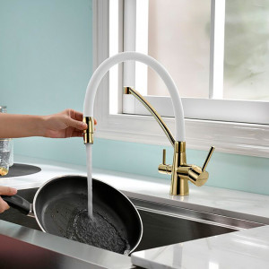 Смеситель для кухни Paulmark SIEGEN Si213111-Gw — это гармоничное сочетание роскошного дизайна и передовых инженерных решений. Блестящее золотое покрытие придаёт смесителю элегантный, премиальный вид, а контрастный белый шланг добавляет современности и упрощает визуальный контроль за состоянием подводки.
