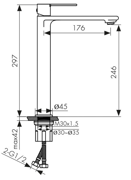 - Смеситель, гибкая подводка, комплект для монтажа.