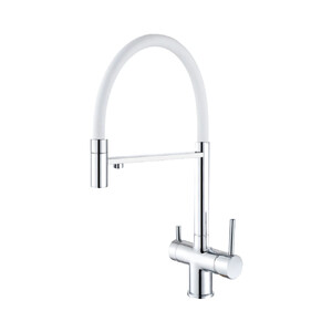 - Однорычажный, с подключением к фильтру, поворотный, гибкий силиконовый излив для воды.